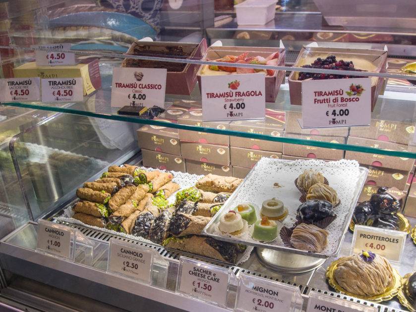 Цена каноли была 3 евро, но в том же Pompi мы видели их потом за 2,5 евро.