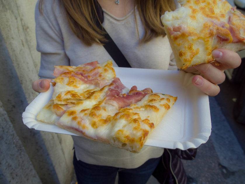 Самая распространенная уличная еда в Риме – это пицца кусками (pizza a taglio). Чтобы разжиться хорошей пиццей, ищите заведение с надписью Forno (пекарня). Понравившуюся пиццу вам отрежут, взвесят и разогреют. Загляните в одну из старейших римских пекарен Forno Campo de’ Fiori на одноименной площади.