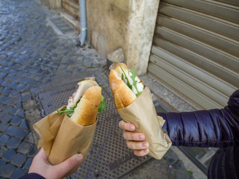 Совсем не диетический, но очень аппетитный перекус. Популярны панини с поркеттой (panino con porchetta). Рецепт прост: перед тем как положить в бутерброд, свинину шпигуют чесноком и специями и вымачивают несколько часов. Купить панини можно в лавочках под вывесками Panini и Paninoteca. В центре Рима таких много.