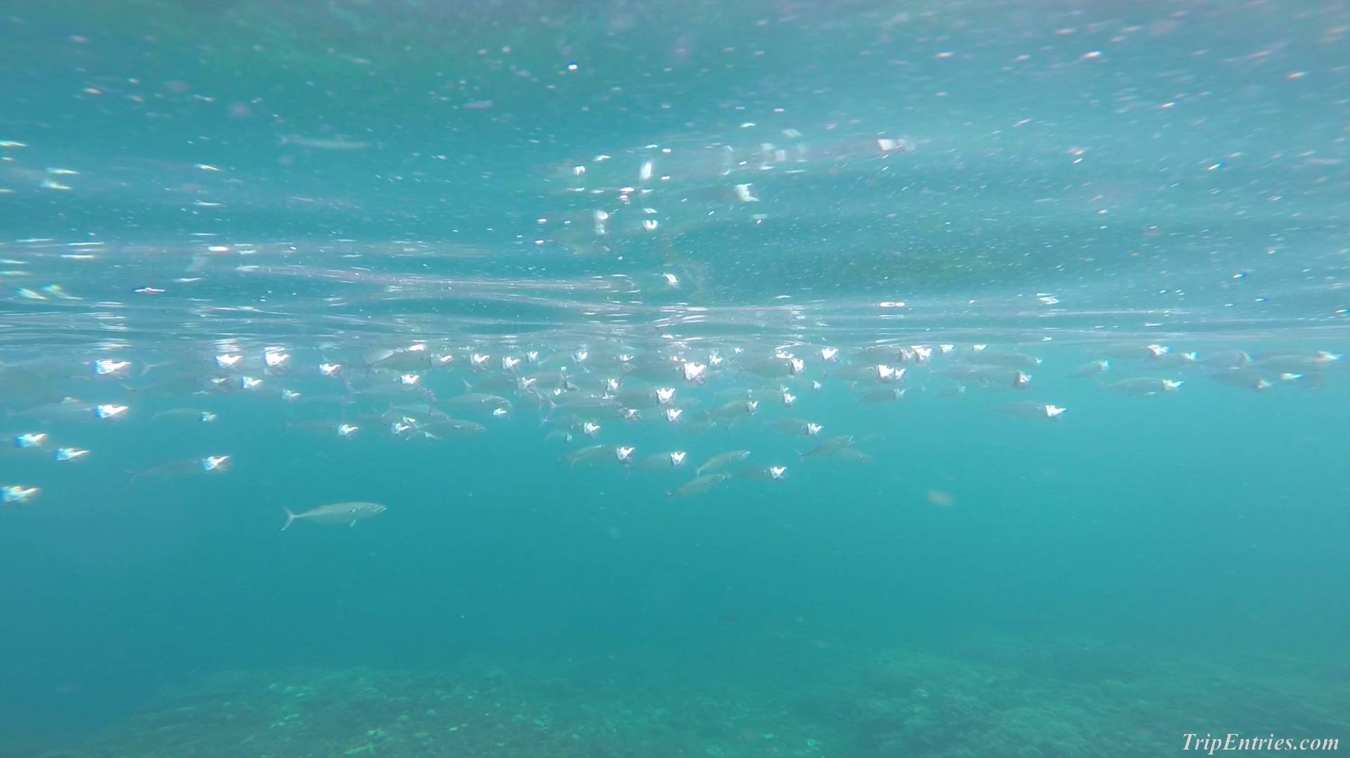 Практически у самой поверхности воды проплывают косяки прозрачных рыбок, они так отражают свет, что порой непонятно — это рыбка плывет или ее отражение.