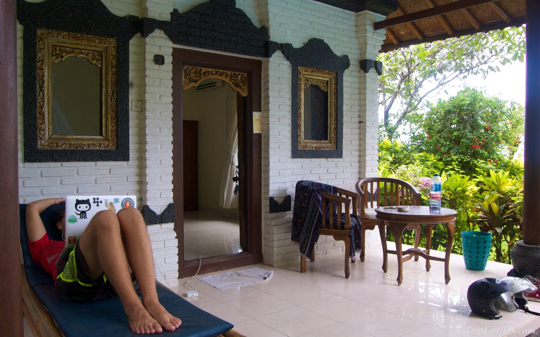 Практически от самой Чандидасы нас преследовал дождь и даже дождевики не сильно спасли, так что в первую очередь хотелось поскорее найти себе жилье и снять уже насквозь мокрые джинсы и кеды. То ли сезон не тот, то ли будний день, то ли тут всегда так, но жилья свободного было очень много. Мы посмотрели пару гестов в самой бухте, но там не оказалось горячей воды в номерах, что уж говорить про ванну, о которой уже давно мечтаем. Проехали чуть дальше и нашли отличный вариант.
