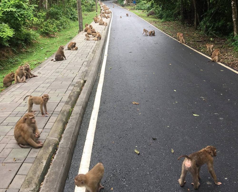 Дорога, ведущая к вершине горы, достаточно узкая и имеет значительный уклон, спускаться по ней на байке или автомобиле не удобно, поэтому высоко заезжать не стоит, тем более, что мест на небольшой парковке может не оказаться. У начала пути туристов встречают две позолоченные скульптуры сидящих обезьян, но чтобы увидеть их живые прообразы, нужно подняться выше – места обитания макак расположены ближе к вершине горы.