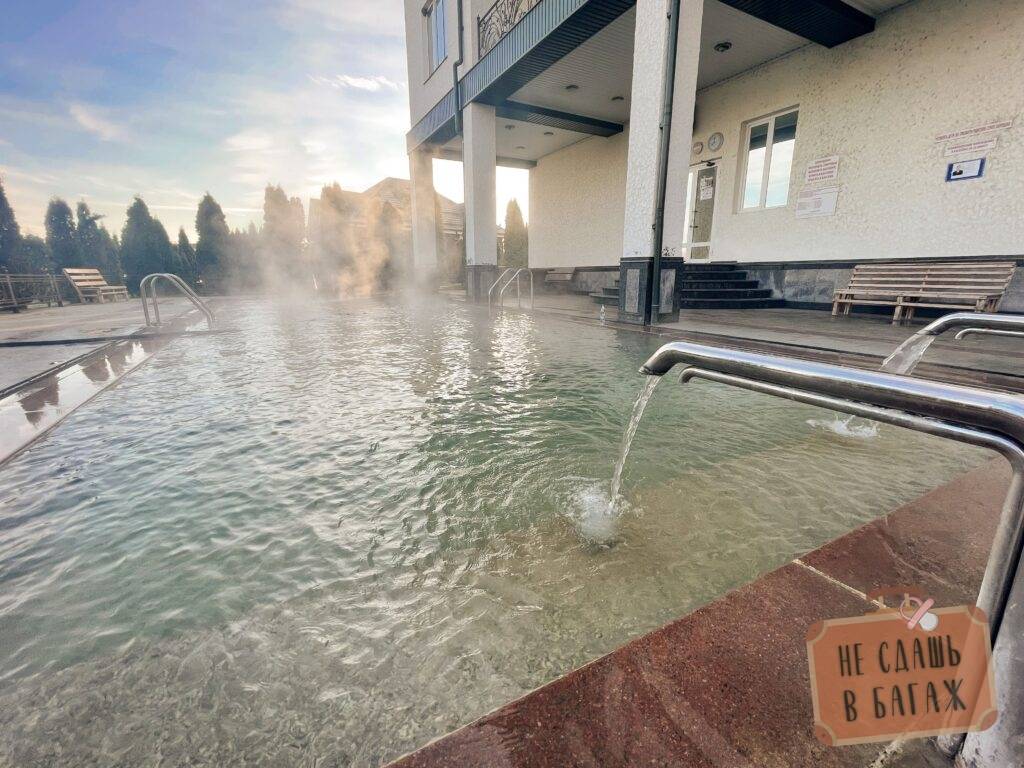 В этом отеле есть два варианта размещения: в большом гостиничном доме и пользоваться общим бассейном, или маленькие домики на 2-4 человек и пользоваться личным бассейном. Перед каждым домом находятся небольшие бассейны размером 1 на 2 метра. Вода здесь очень горячая, да и вообще, горячие источники не предполагают плавания. Поэтому очень круто поседеть своей компанией в индивидуальном бассейне после целого дня гуляний по горам и ледникам Кабардино-Балкарии.