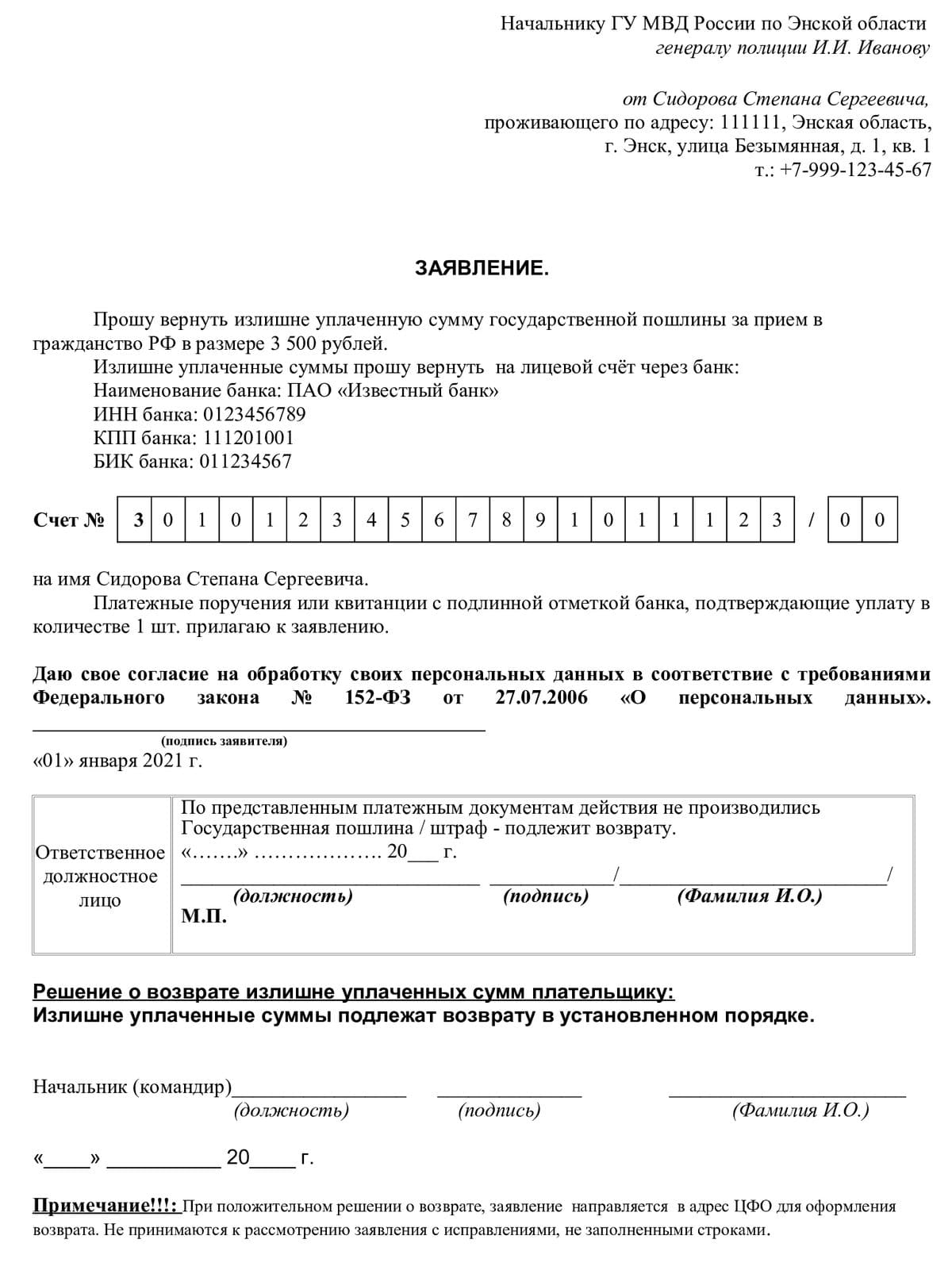 В качестве примера может послужить квитанция на уплату госпошлины за гражданство РФ в Москве.