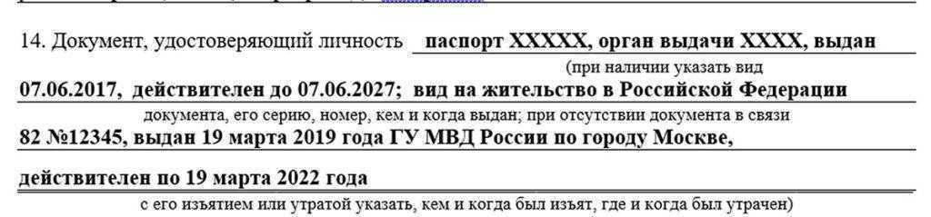 Под номером 14 запишите данные паспорта в точности, как в переводе документа. Здесь же укажите информацию о виде на жительство (как в мотивах). Сведения об РВП и других статусах здесь вносить не нужно.