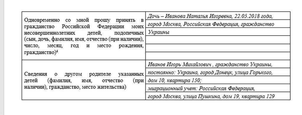 Сведения , пункты в заявлении по Указу составляются также, как в основной анкете на гражданство. Информацию по их заполнению вы найдете выше в статье. На фото вы можете посмотреть образец того, как выглядят данные пункты в анкете для ДНР.