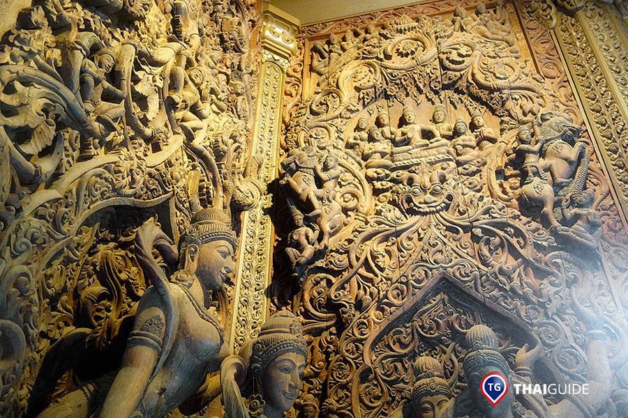 Если этого не знать, то храм можно принять за древний, так как новым он точно не выглядит. Он полностью построен из самых дорогих пород деревьев – тика и железного дерева. По задумке, при строительстве не должны были использовать гвозди, но во многих местах дерево уже одряхлело и прогнило, поэтому гвозди все же есть. Строители вгоняют их не полностью, чтобы после реставрации вытащить.