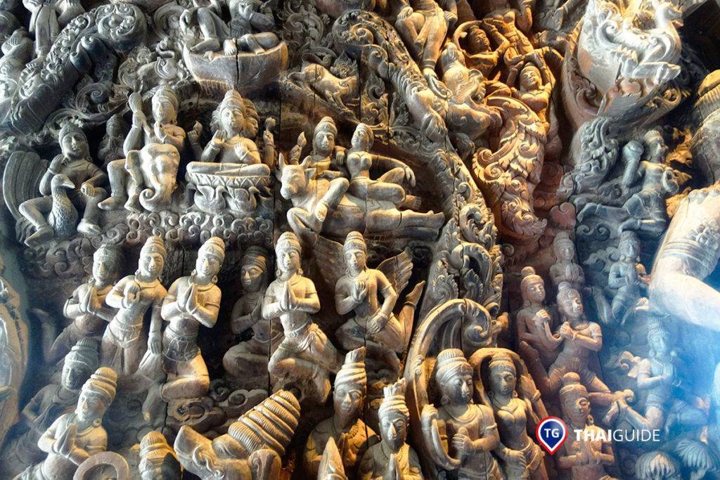 Теперь несколько строк о самом храме. Храм истины полностью построен из дорогостоящих пород дерева — тик и железное дерево. Крепится конструкция без единого гвоздя, но это не совсем правда. Фактически да, готовые части строения не содержат в себе ни грамма метала, а вот строящиеся сначала крепятся с помощью гвоздей, а после завершения всех монтажных работ гвозди извлекаются. Внутри храма можно увидеть и потрогать деревянные замки, используемые при строительстве. Долгосрочное строительство сопряжено еще и с тем, что несмотря на долговечность тикового и железного дерева, они постепенно разрушаются, и идет процесс непрерывной реставрации. Храм, это средоточие восточной культуры под одной крышей. Задумка основателя заключалась в том, чтобы соединить все религиозные ответвления под крышей храма, но пока тут создано четыре зоны: