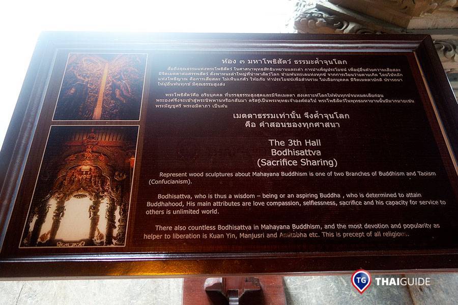 В храме объединяются в одно целое религии четырех стран — Таиланд, Китай, Индия и Камбоджа. Храм истины состоит из четырех залов и центрального помещения. Что символизирует каждый из них — чуть ниже в соответствующем разделе.