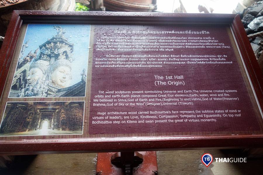 В храме объединяются в одно целое религии четырех стран — Таиланд, Китай, Индия и Камбоджа. Храм истины состоит из четырех залов и центрального помещения. Что символизирует каждый из них — чуть ниже в соответствующем разделе.