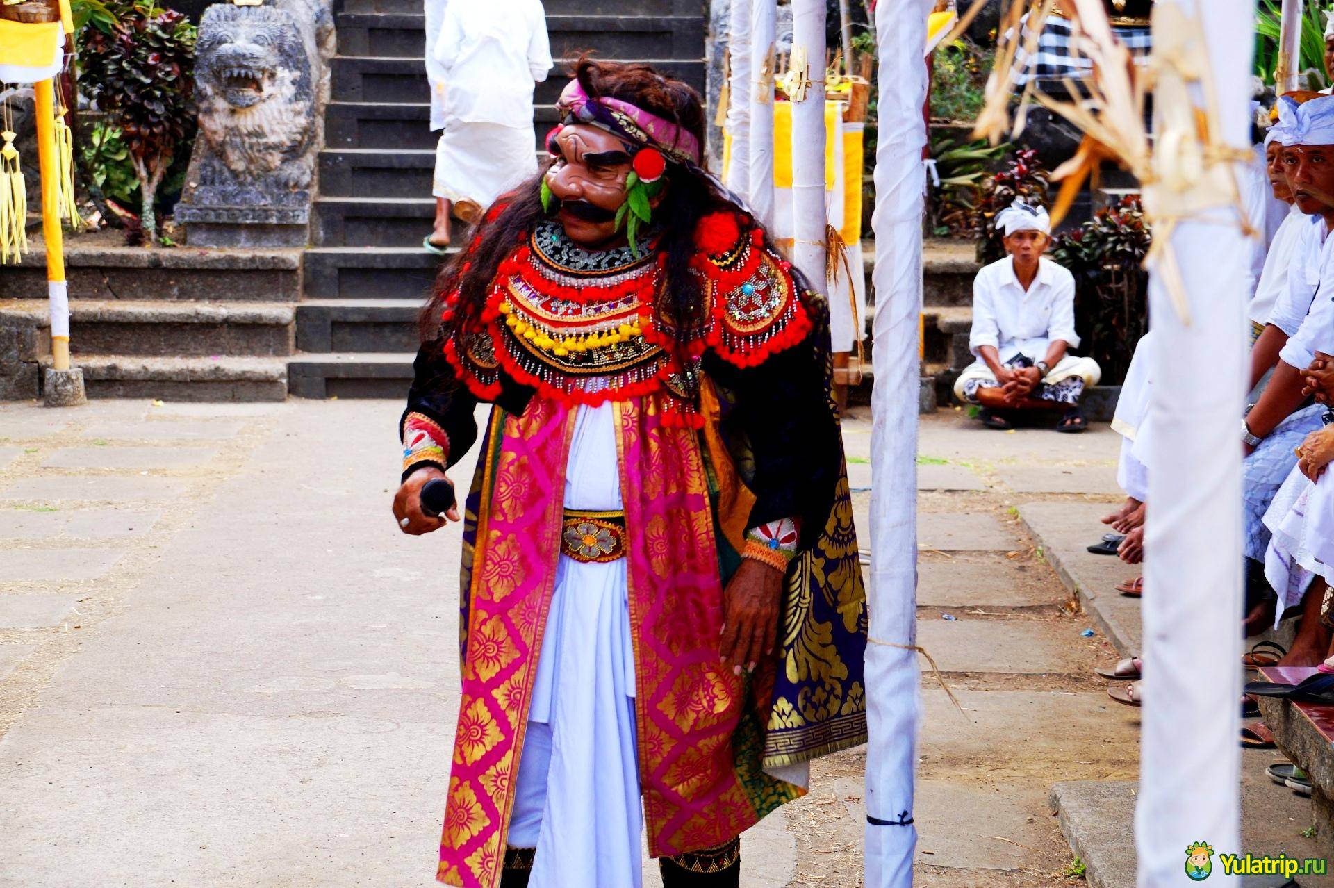 На фото выше вы видите человека, он и еще 1 человек, который как мне показалось, был в костюме женщины, ходили с микрофонами в руках и что-то говорили друг другу. На лице у них одеты маски. При этом, мужчина, которого вы видите на фото, издавал те самые страшные звуки, которые я описывала и как будто «наступал» на женщину, сдвигая ее к краю площадки. Через какое-то время, женщина начинала наступать на мужчину. А сбоку сидели балийцы, участвовавшие в церемонии, и играли на инструментах. Рядом также сидели женщины и дети, которые наблюдали за всем этим.