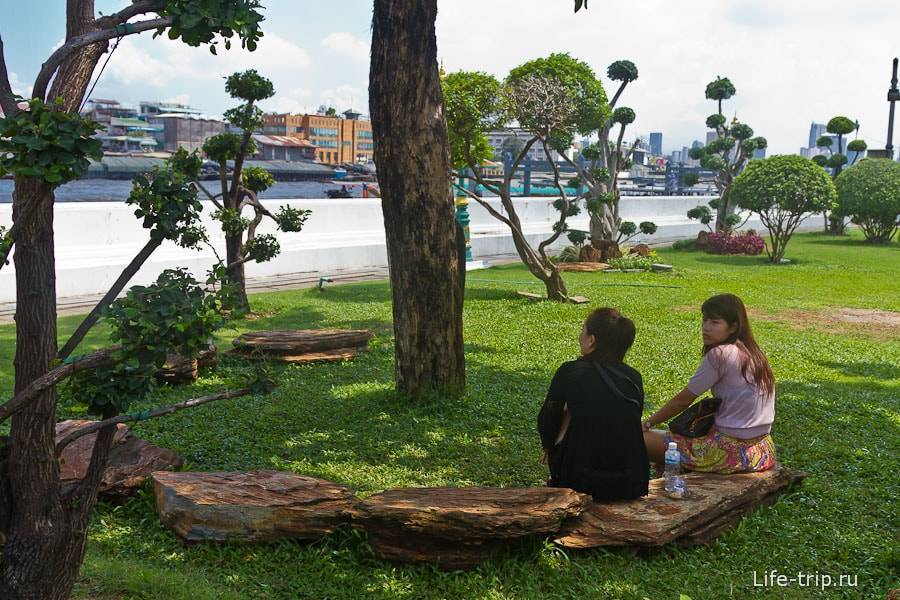 Вдоль речного берега выстроились 6 тайских павильонов в китайском стиле. Построенные из зеленого гранита, они предназначены для встречи верующих; сооружения с крышей, но без стен – у буддистов нет тайн.
