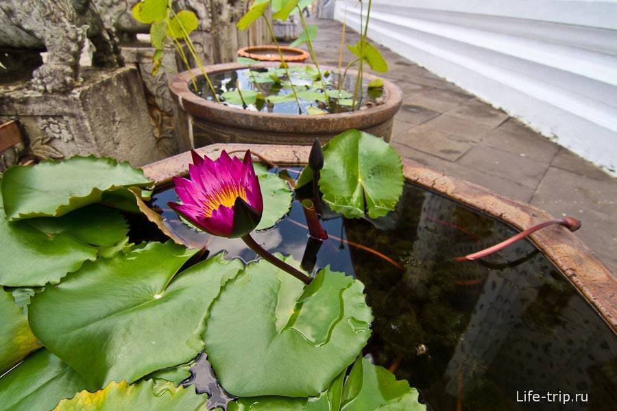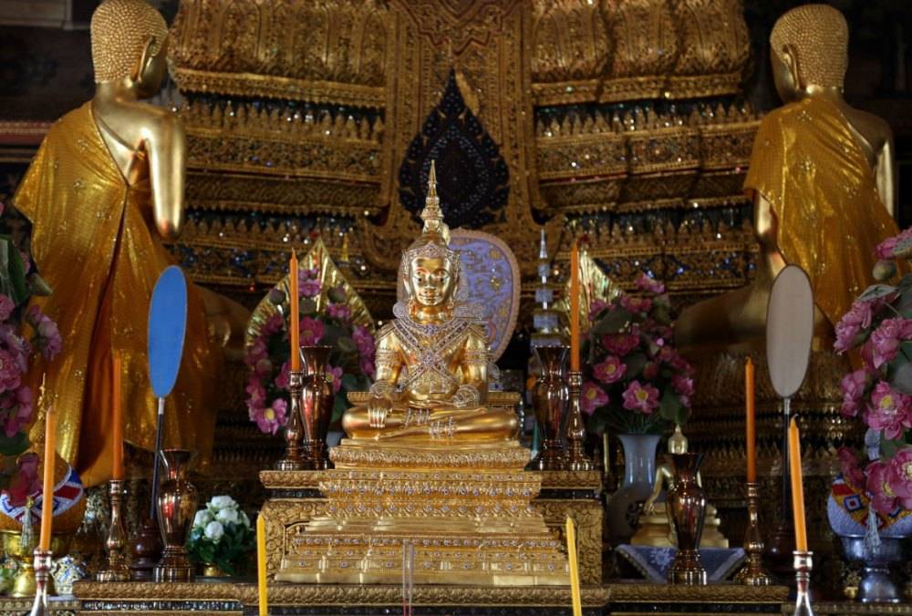На мраморном цветке лотоса – хрустальная сфера с мощами Будды. Много лет в этом храме находилась главная святыня страны, перенесенная в другой храм, – статуя Изумрудного Будды. В действующем храме верующие возносят молитвы.