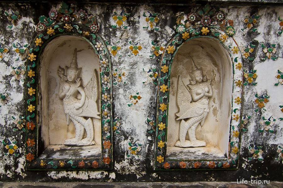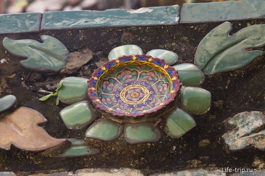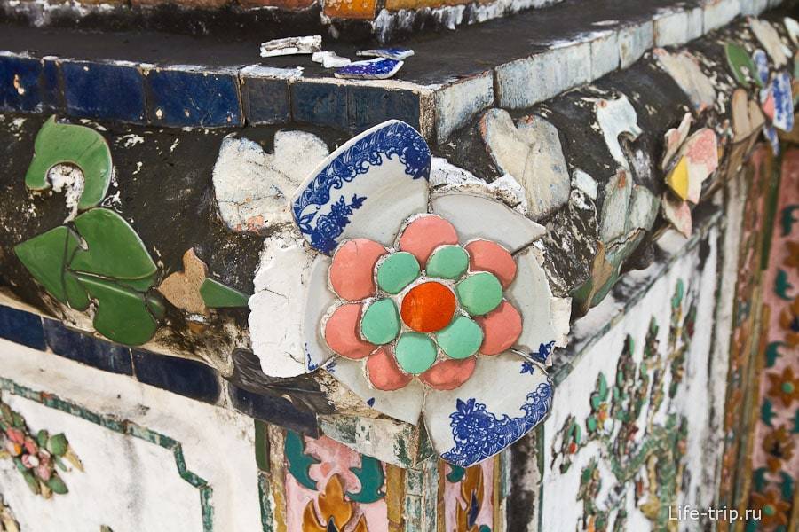 Фарфор был очень дорогим украшением, поэтому стены святилища выложены его осколками: битую посуду скупали в Китае и привозили в Таиланд в корабельных трюмах, что обходилось дешевле.