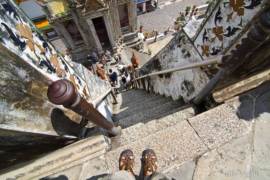 Насмотревшись на виды Бангкока, спускаемся вниз. Спуститься гораздо сложнее, чем подняться, особенно если боитесь высоты. Я была в этом храме 2 раза, в первый раз было страшно, а во второй — привыкла, так что подъемы — спуски уже воспринимались как небольшая прогулка. Причем страшнее всего спускаться с 1 этажа, т.к. там нет перил.