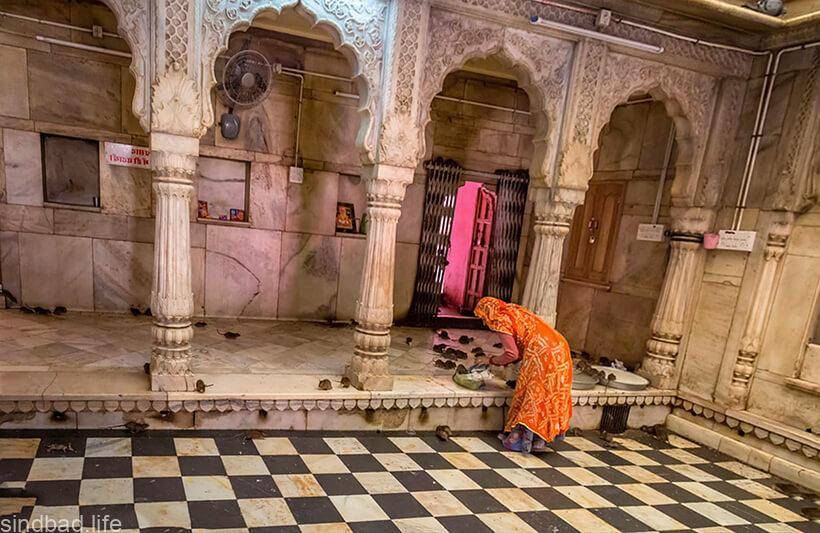 Храм открывается в 4 часа утра. После богослужения священники раздают верующим специальную еду, которую можно скармливать грызунам. Это зерно, сахарные шарики и коровье молоко.