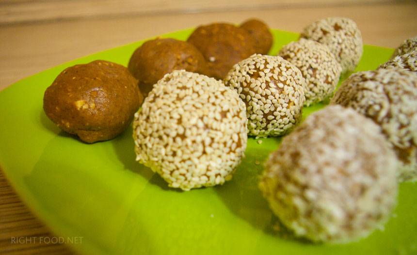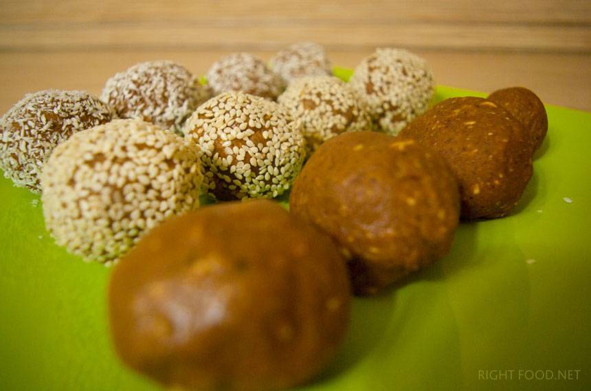 Все ингредиенты, за исключением кунжута, сложить в миску и размешать. Для придания большей вязкости ввести немного жидкого мёда. Руки смазать растительным маслом и скатать шарики. Прокатать их в остывшем кунжуте.