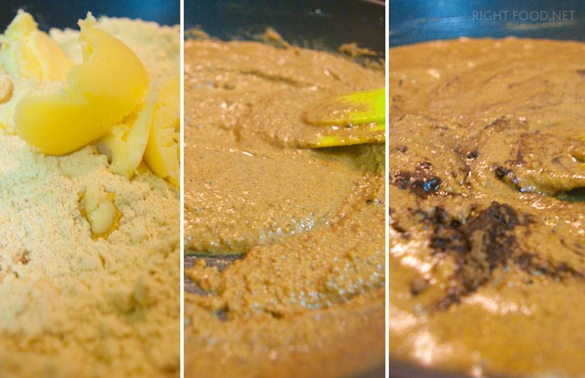 Рецепт индийского Ладу невероятно прост и готовится очень быстро. Для начала ставим на средний огонь большую сковороду и ждем, пока нагреется. Высыпаем в нее нутовую муку и начинаем помешивать. Прокаливаем муку из нута несколько минут, постоянно перемешивая, пока не появится отчетливый ореховый запах. Теперь уменьшаем огонь и кладем в муку масло Гхи.