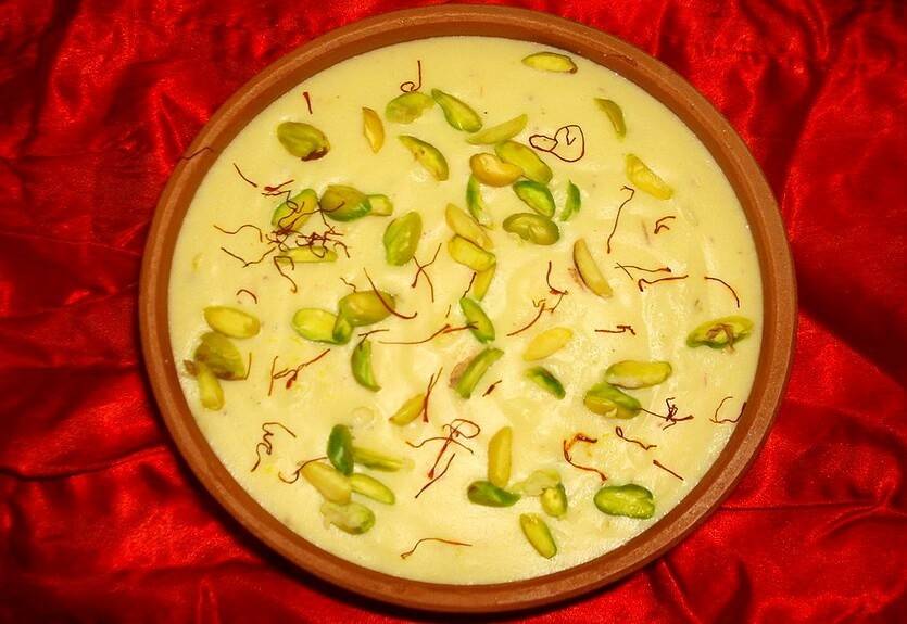 Очень популярный десерт индийской кухни, который кажется привлекательным далеко не каждому туристу. По сути это нечто среднее между молочным пудингом и киселем из риса. Но не спешите отказываться от этого лакомства. Орешки, кардамон и розовая вода меняют его вкус. А посыпка из шафрана с фисташками добавляет аромат. Получается действительно вкусное сладкое блюдо, которое часто нравится даже тем, кто не слишком любит сладости.