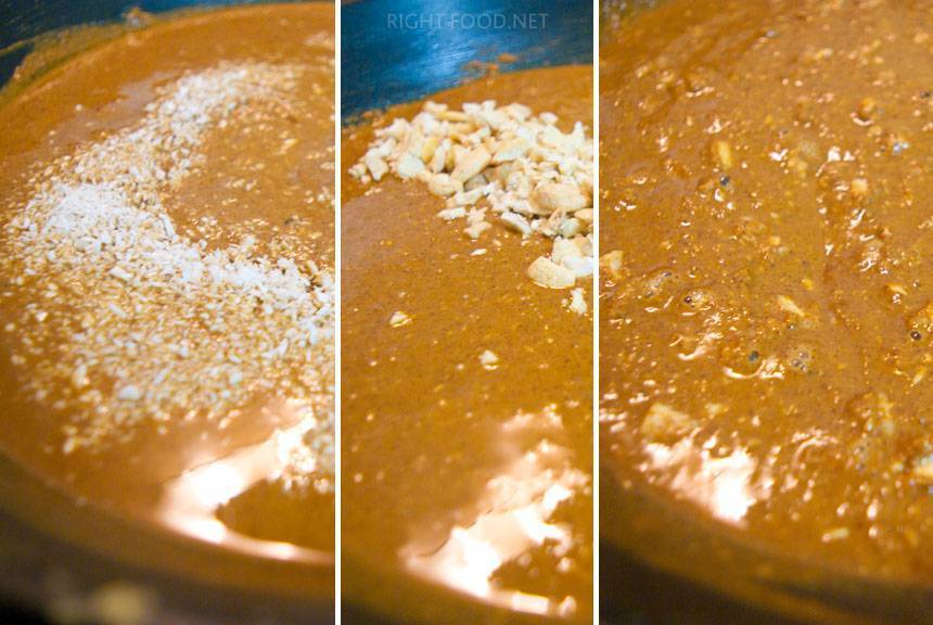 - Насыпьте муку на оставшееся масло. Не выключается огонь, пока мука не станет ароматной.