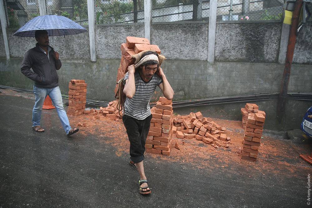 В этой части Индии принято груз носить на ремне, а ремень надевать на лоб. Мужики носят кирпичи.