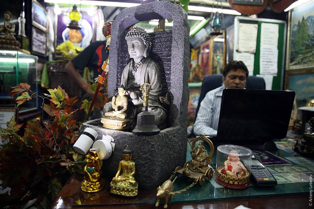 Познакомились с колоритнейшим персонажем, который продает билеты, меняет деньги и организует экскурсии. Феноменальный жулик, прохвост и лапочка. Весь его офис заставлен Ганешами, макетами дарджилингского паровоза, Шивами и прочими Буддами. Половина экспонатов двигаются или вращаются. Журчит настольный фонтанчик, напоминая речь самого турагента: «Мадам, я двадцать два года работаю в туристическом бизнесе, и могу заверить вас, что никакой комиссии я никогда не беру». При этом у него курс доллара 50, хотя везде — 63.