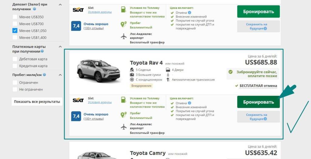 - Если у вас есть конкретные пожелания к авто, то в левой колонке вы можете их задать. Например, я все время выбираю автоматическую коробку передач (трансмиссию) и залог менее 1000 долларов. Ставьте галочки напротив нужных вам опций и предложенные варианты на странице обновятся.