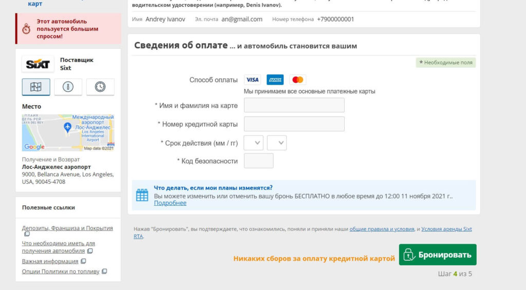 - Далее вводите данные своей карты. На этом этапе это может быть любая карта – необязательно, чтобы она принадлежала водителю или была кредитной, вы можете снять автомобиль в США и оплатив его обычной дебетовой картой, например, Сбербанка или Тинькофф банка. Кредитная карта нужна уже в США при получении автомобиля, чтобы оплатить залог.