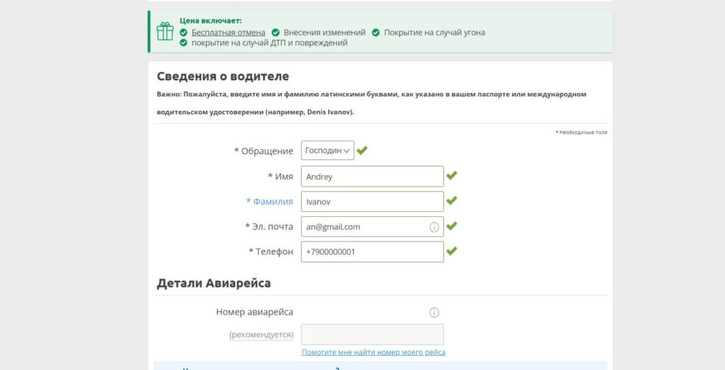 - Если всё в порядке, заполняйте данные о водителе. Если вы выбрали опцию доп. водителя, то его заполнять все равно не надо, данные второго водителя возьмут в офисе проката в США, здесь требуются данные только основного водителя.