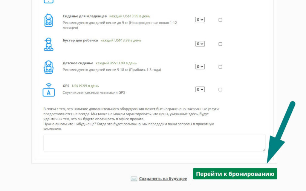 - На странице вы увидите возможные дополнительные опции, например, GPS навигация, или сиденье для ребенка. Если вам что-то требуется, то лучше добавить на этом этапе, а не в день проката, так как, например, детского кресла может не оказаться. Если вы заранее выберите дополнительную опцию, то вам ее точно предоставят.