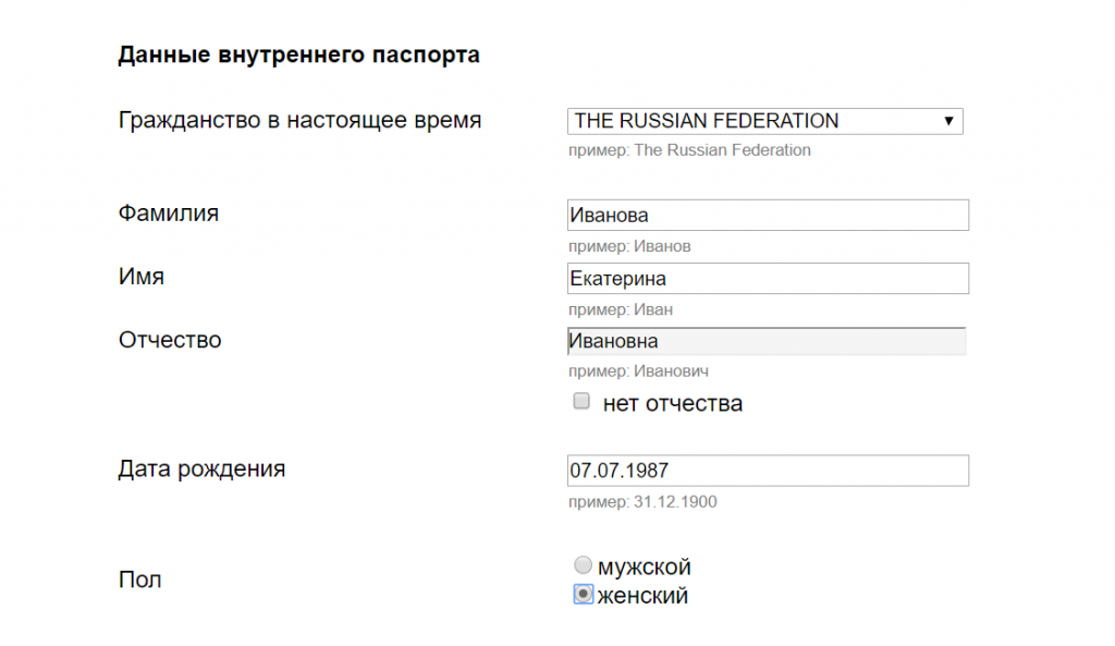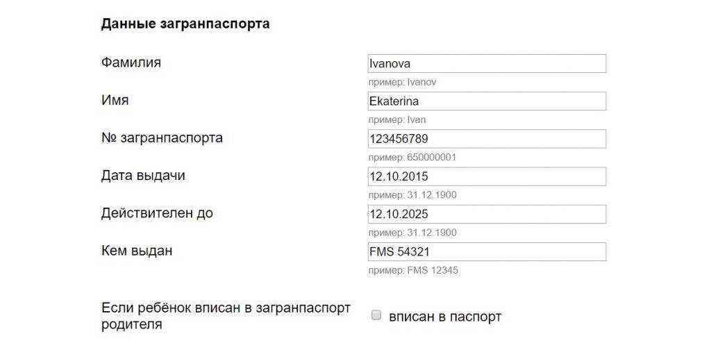 Заполните строки с ФИО и датой рождения, в соответствии с российским паспортом, а также данные заграничного паспорта и контактные данными. Все это находится на одной странице.