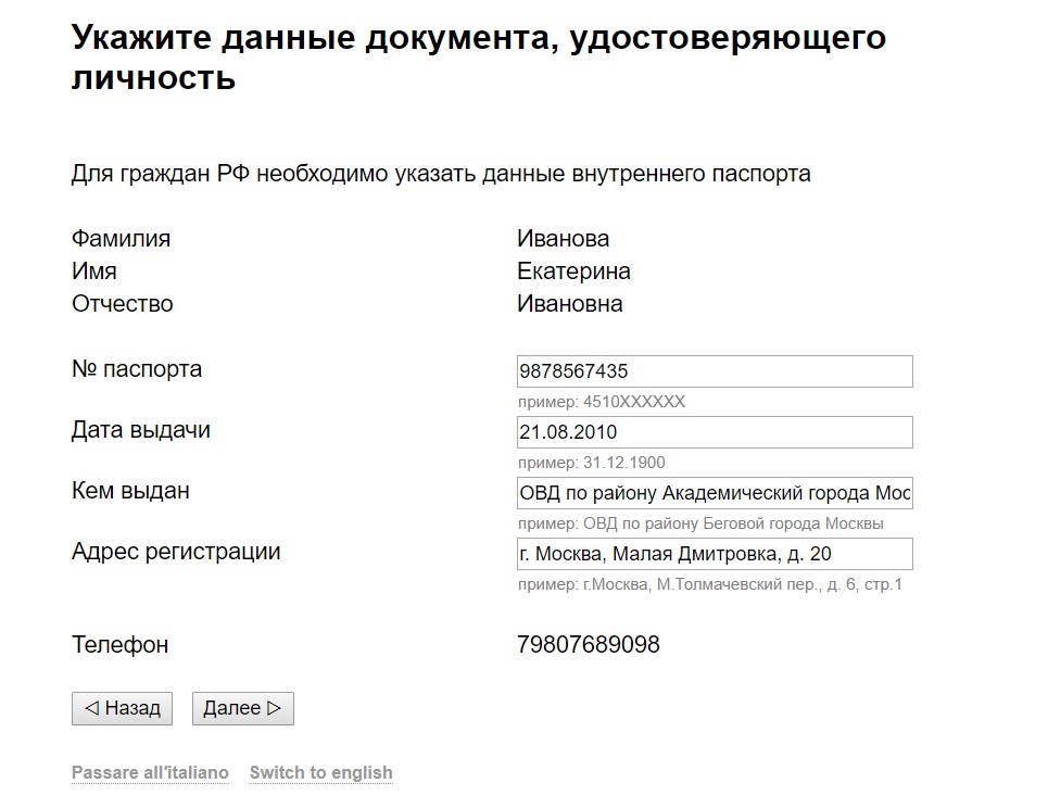 Теперь введите данные своего гражданского паспорта: серию, номер, дату выдачи, организацию, выдавшую паспорт, и адрес прописки.