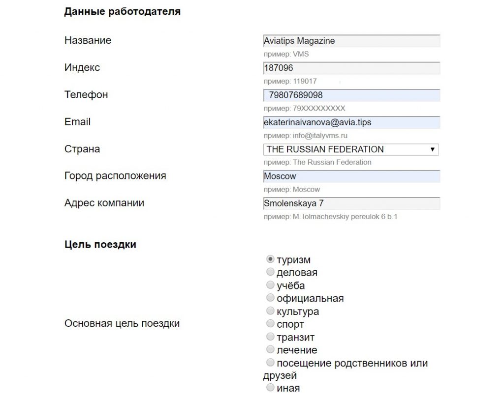 На этой же странице содержится информация о работодателе: название организации, почтовый индекс, номер телефона вашей организации, адрес электронной почты и точное местонахождение. Тут же вы выбираете цель поездки.