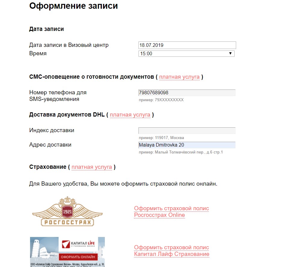 На следующей странице вы можете выбрать дату записи в ВЦ, указать номер для SMS-уведомления, а также адрес для доставки готовой визы (обратите внимание, что это платные услуги ионии необязательны). Здесь при желании можно оформить страховой полис