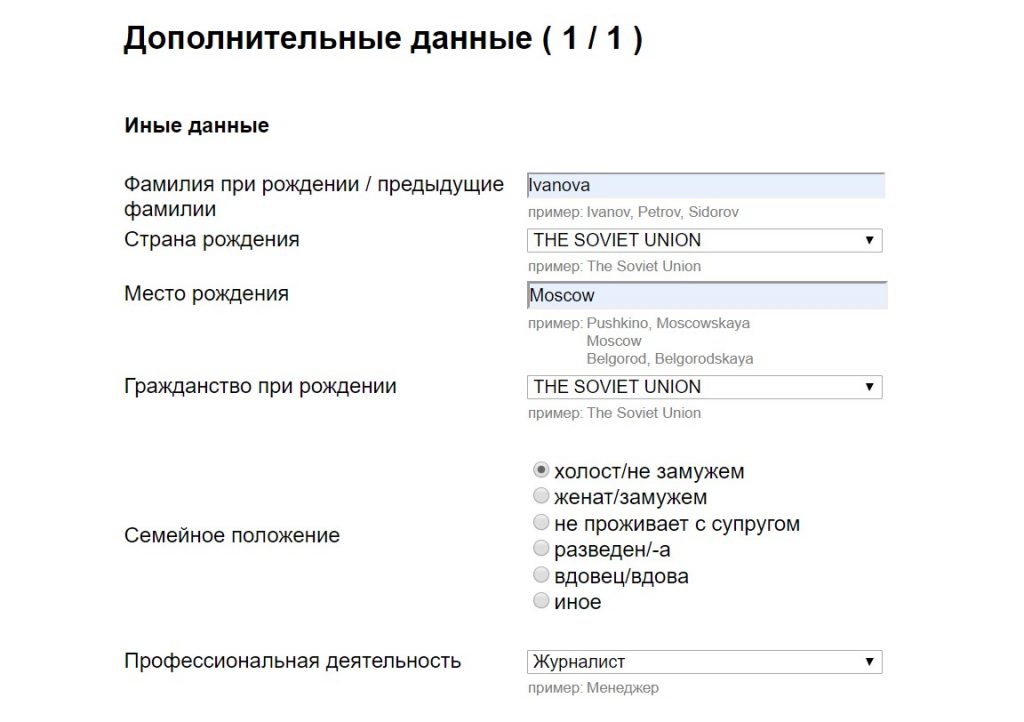 Далее необходимо указать дополнительные данные, в том числе профессиональную деятельность.