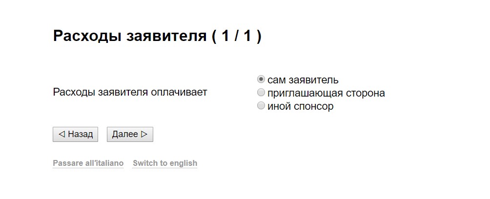 На следующем этапе отметьте, кто оплатит расходы: вы, приглашающая сторона (если у вас есть приглашение) или спонсор (родители, муж/жена).