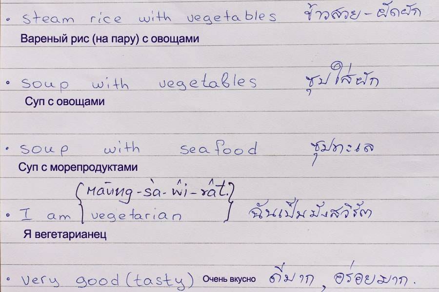 | Я вегетарианец | Пхом (чан) пен мангсавират кхрап(кха) | ผม (ฉัน) เป็นมังสวิรัติ |
