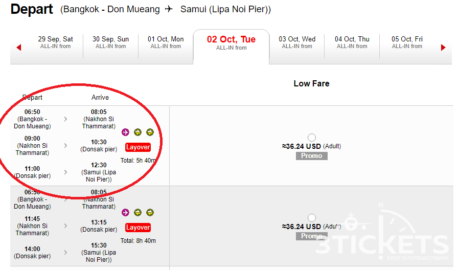 Сколько по времени добираться от Бангкока до Самуи? Посмотрим на сайте ЭйрАзия. К примеру, вылет – в 06:50, в аэропорт выехать нужно будет за 3 часа (в 03:50), а прибытие на пристань Самуи в 12:30. Итого выходит — 9 часов пути.