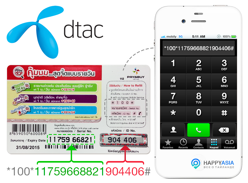 Однако, существует еще один способ пополнения баланса. Можно приобрести в магазинах 7-Eleven или Family Mart специальную карту (money-card) для пополнения баланса. Она бывает на 100, 200 и 500 бат. Активировать карту и пополнить баланс sim-карты мобильного оператора DTAC (Happy) можно введя запрос *100*номер серии карты номер id#, затем нажать вызов. Но в любом случае инструкцию написана на карте, поэтому разберетесь. После данной процедуры деньги поступят на счет.