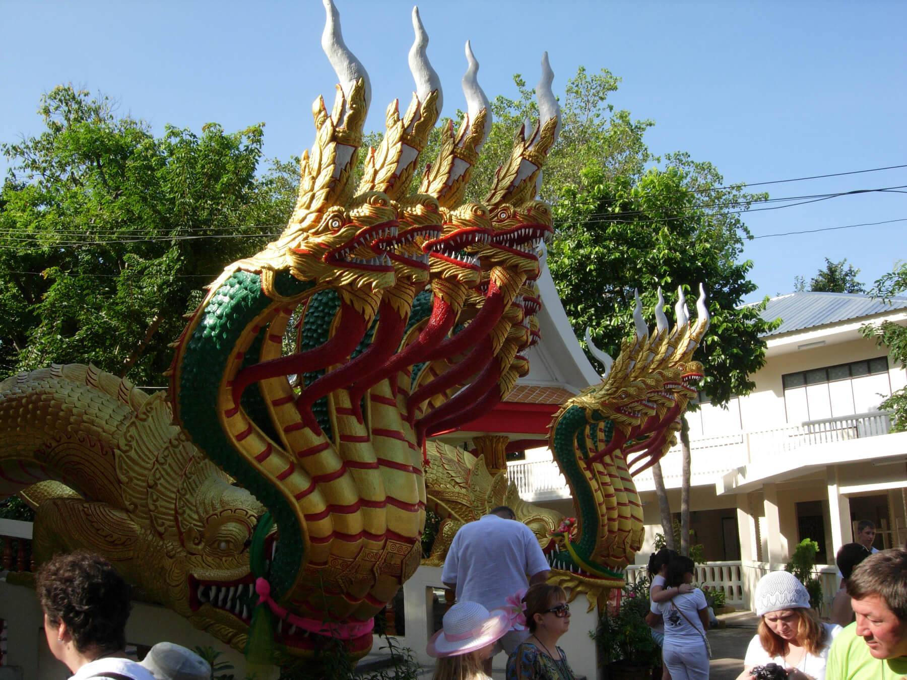 Центральный элемент комплекса — статуя Будды, охраняемая двумя семиголовыми драконами.