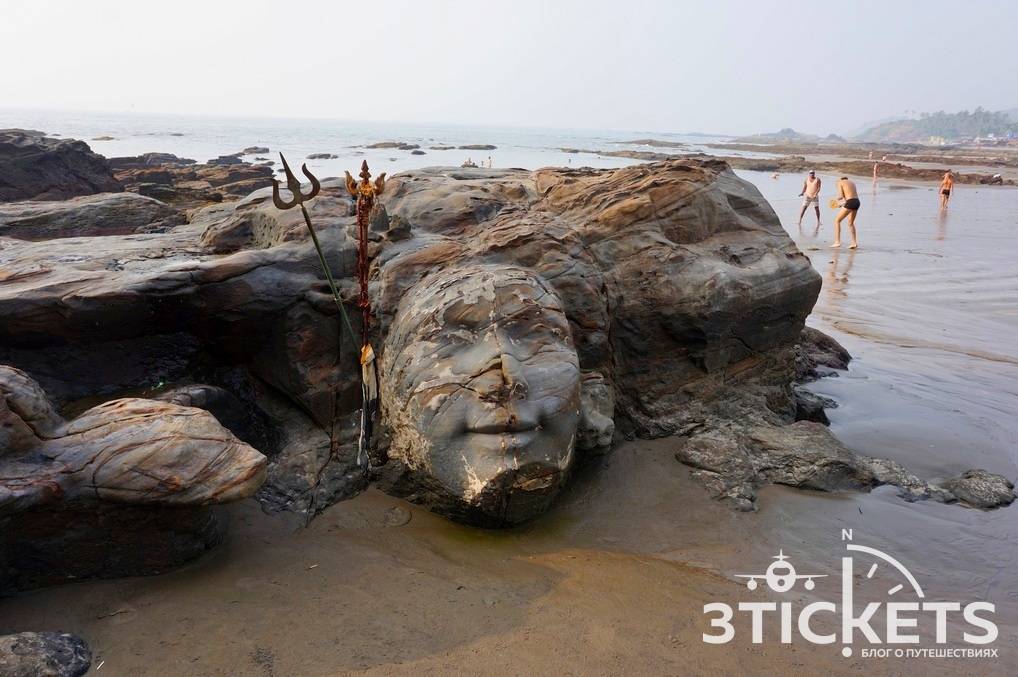 Но знаменит этот пляж, в первую очередь, не коровами и скалами, а лицом бога Шивы, высеченным прямо на одном из валунов. Рядом с лицом уже довольно сложно, но все еще можно увидеть обязательные атрибуты Шивы — ожерелье из черепов (символизирующее победу над плотью) и кобру (символизирующую космическую энергию и бессмертие).