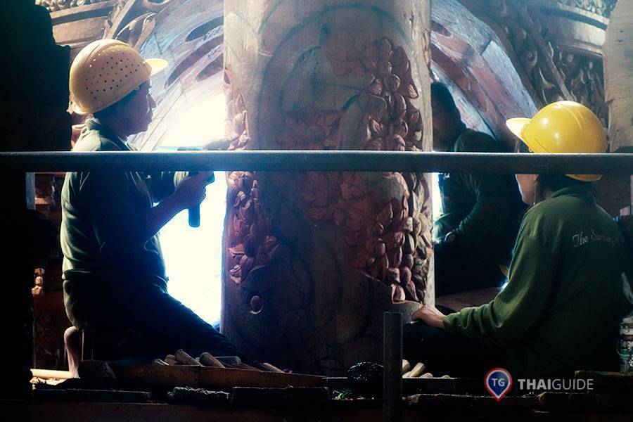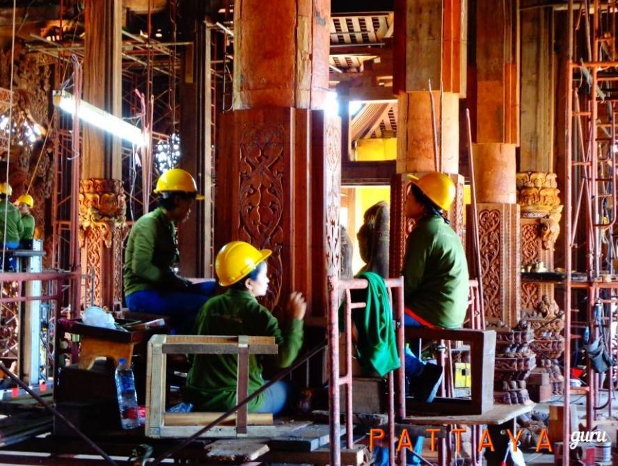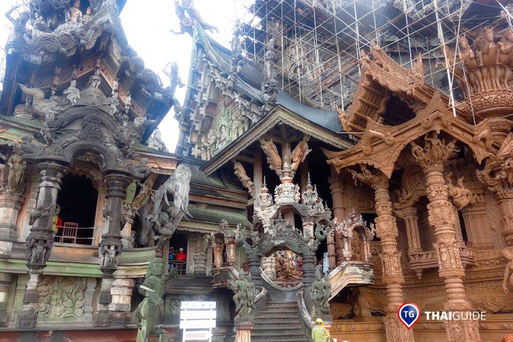 Строительство деревянного храма в Паттайе ведется непрерывно, в нем работают 200 искусных резчиков по дереву. Перестук их молотков сливается со звуками мистической музыки, а глядящие на экскурсантов со сводов женщины, младенцы и мифические чудовища сгущают атмосферу таинственности и потусторонности почти до материальной ощутимости.