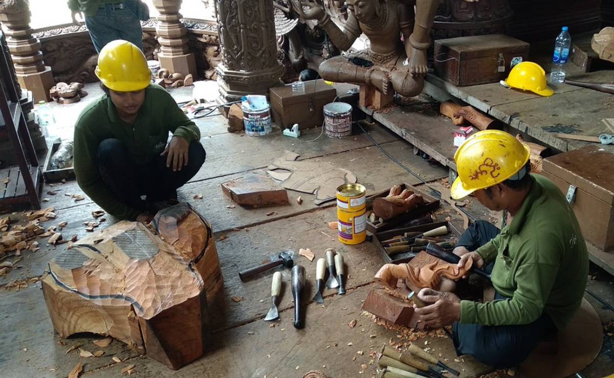 Если этого не знать, то храм можно принять за древний, так как новым он точно не выглядит. Он полностью построен из самых дорогих пород деревьев – тика и железного дерева. По задумке, при строительстве не должны были использовать гвозди, но во многих местах дерево уже одряхлело и прогнило, поэтому гвозди все же есть. Строители вгоняют их не полностью, чтобы после реставрации вытащить.