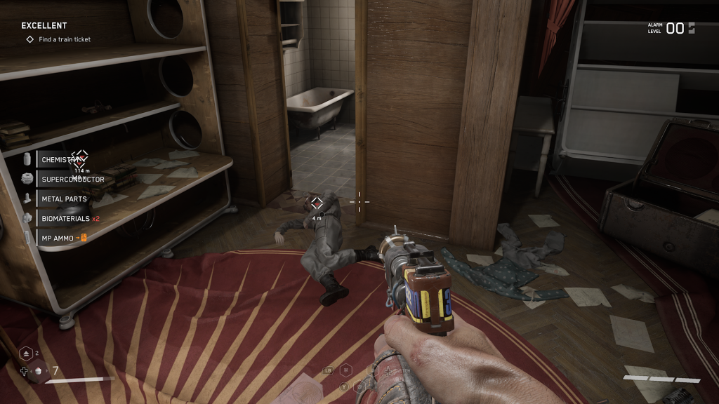 - Войдите в заднюю кухню и найдите окно с полимерной жидкостью. Проплывите через него, чтобы попасть в заблокированную комнату на верхнем этаже. Поговорите с трупом внутри и упомяните о просроченном билете — черт предложит вам свой месячный проездной. Истратьте все варианты разговора, чтобы получить его.