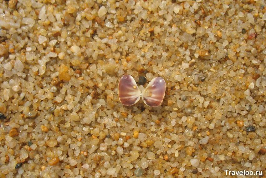На пляже и в воде мягкий приятный песок без камней. Иногда встречались маленькие ракушки и крабики по вечерам.