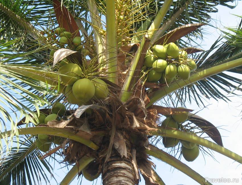 Здесь очень много кокосовых пальм, кокосы постоянно срезают специально обученные люди, но иногда они всё же падают из-за сильного порыва ветра