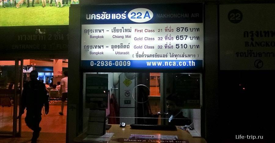 Билет стоит от 400 до 900 бат в зависимости от класса. Мы ехали в первом классе за 563 бата — вполне приличные условия, кондиционер, печеньки с водой, плюс ко всему ровные дороги! Билеты всегда в наличии, ну может во время праздников сразу не уедете-придется пару часов подождать.
