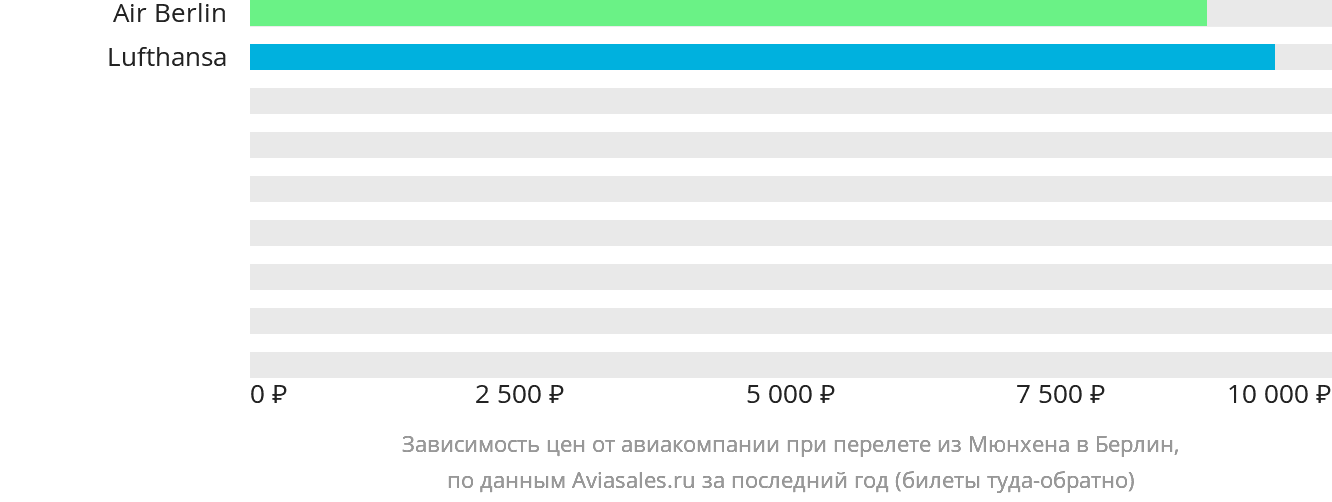 На графике приведены сравнительные цены на авиабилеты из Мюнхена в Берлин самых популярных авиакомпаний. Опираясь на эту информацию, вы сможете спланировать свою поездку и купить авиабилеты из Мюнхена в Берлин у подходящего вам перевозчика.