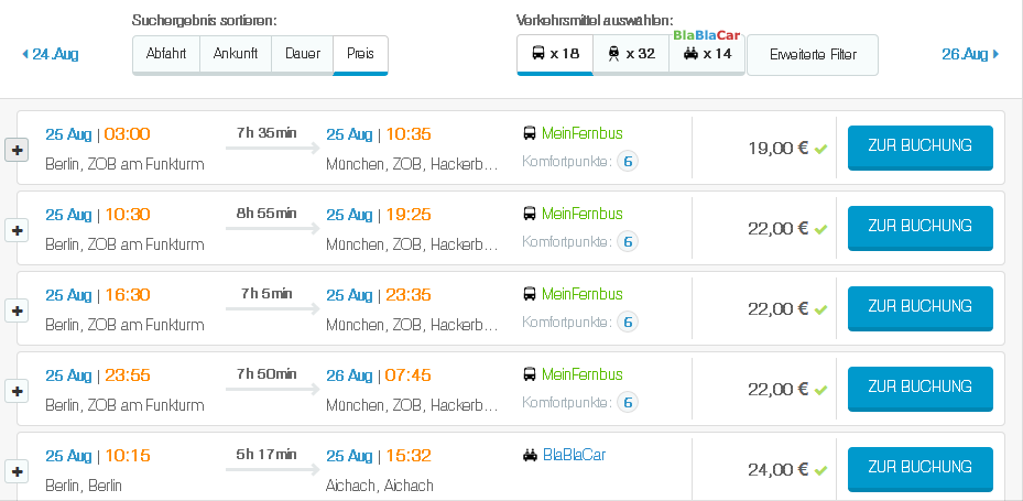 Билеты всегда лучше покупать заранее: так, 25 августа билет на автобус Берлин — Мюнхен стоит 48 евро (не действует Tariff TAP), а на 24 сентября можно приобрести билет всего за 18 евро!