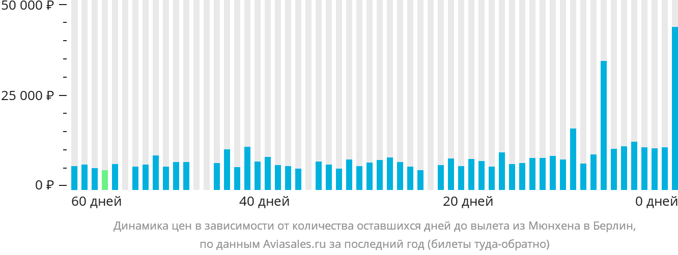 Посмотрите, как менялась цена на авиабилеты из Мюнхена в Берлин в зависимости от времени покупки. С начала продаж их стоимость меняется в среднем на 317%. Минимальная цена по направлению из Мюнхена в Берлин – за 25 дней до вылета, примерно 4 995 рублей. Максимальная цена по направлению из Мюнхена в Берлин – в день вылета, примерно 34 033 рубля. В большинстве случаев раннее бронирование помогает сэкономить, воспользуйтесь этим!